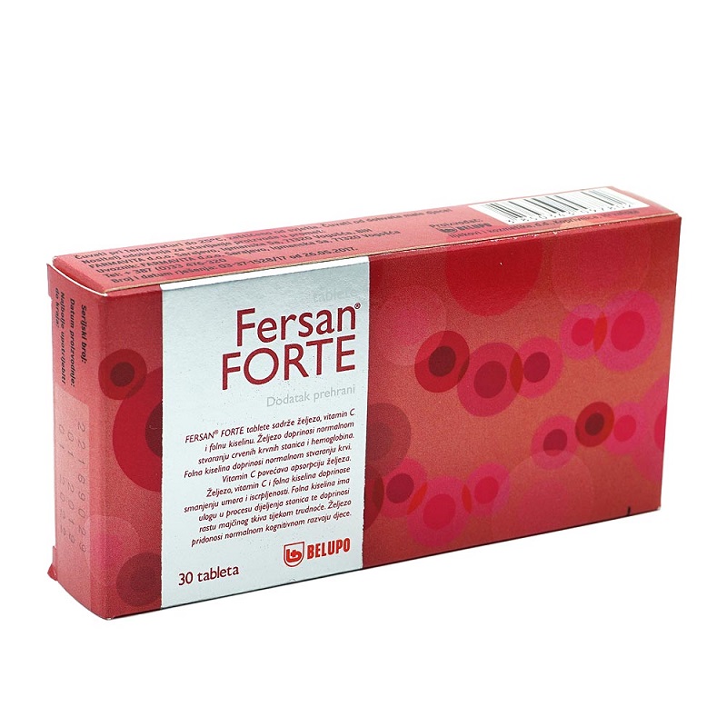 FERSAN FORTE tablete sadrže željezo, vitamin C i folnu kiselinu. Željezo doprinosi normalnom stvaranju crvenih krvnih stanica i hemoglobina. Folna kiselina doprinosi normalnom stvaranju krvi. Vitamin C povećava apsorpciju željeza. Željezo, vitamin C i folna kiselina doprinose smanjenju umora i iscrpljenosti. Folna kiselina ima ulogu u procesu dijeljenja stanica te doprinosi rastu majčinog tkiva tijekom trudnoće. Željezo pridonosi normalnom kognitivnom razvoju djece.