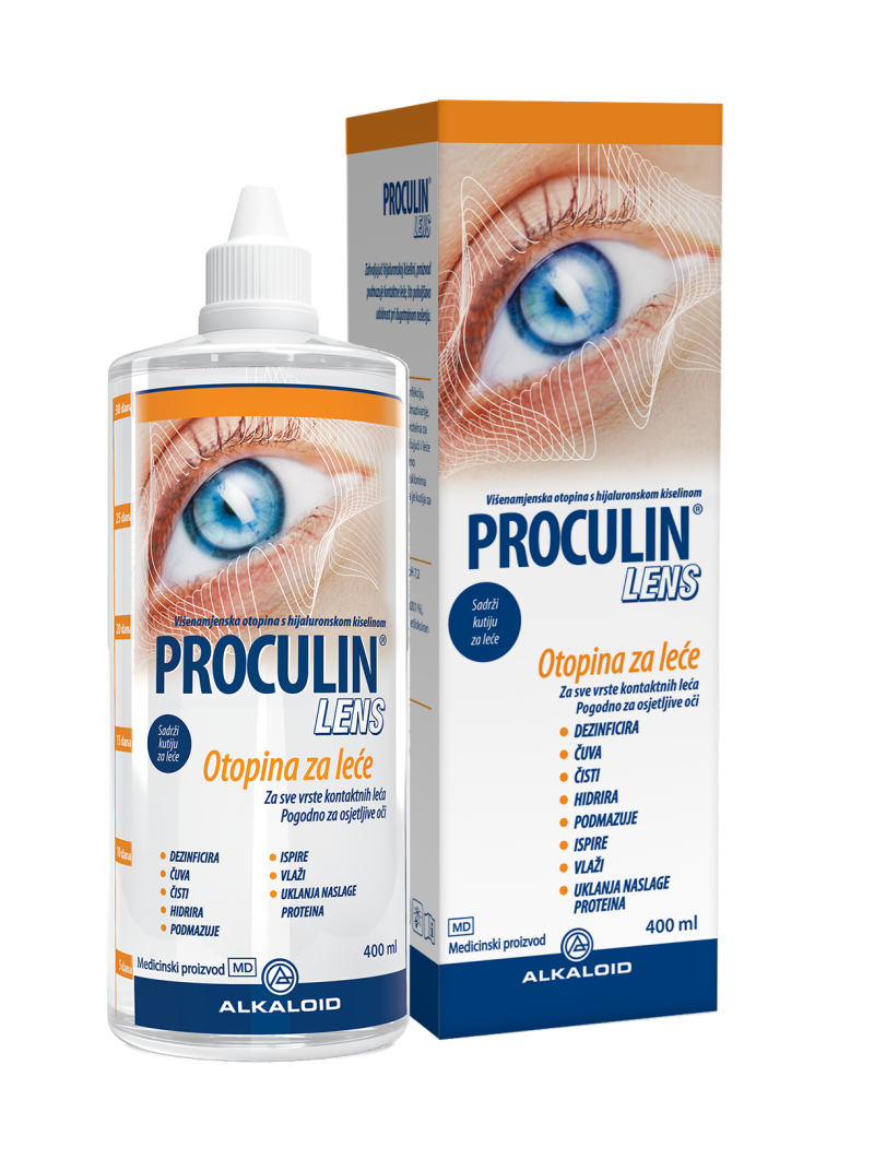 Proculin Lens je višenamjenska otopina za čuvanje leća s hijaluronskom kiselinom, za sve vrste leća uključujući i silikon hidrogel leće.Preporučuje se za osjetljive oči. Čisti, čuva, dezinficira, uklanja proteinske naslage, vlaži i podmazuje.
