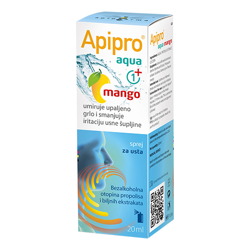 Apipro Aqua Mango sprej za grlo je medicinski proizvod namijenjen za ublažavanje simptoma upale i nadražaja grla, za tretiranje afti i sl.